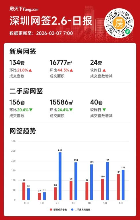 2026年02月06日深圳楼市分化:新房单日涨两成,二手成交双跌!