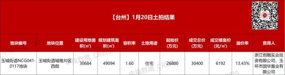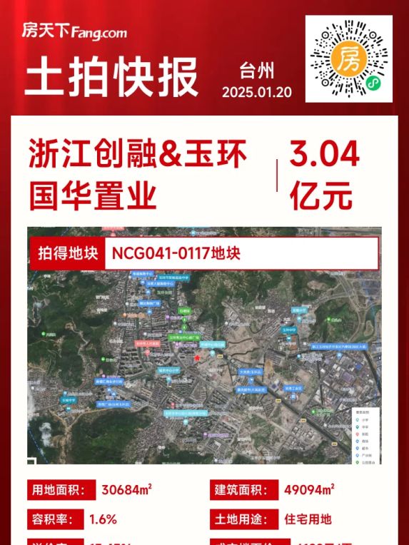 🏆1月20日,玉环城南片宅地引发房企争夺!浙江创融&玉环国华置业历经37轮竞价,以3.04亿元强势拿下玉城街道NCG041-0117地块,溢价率高达13.43%!