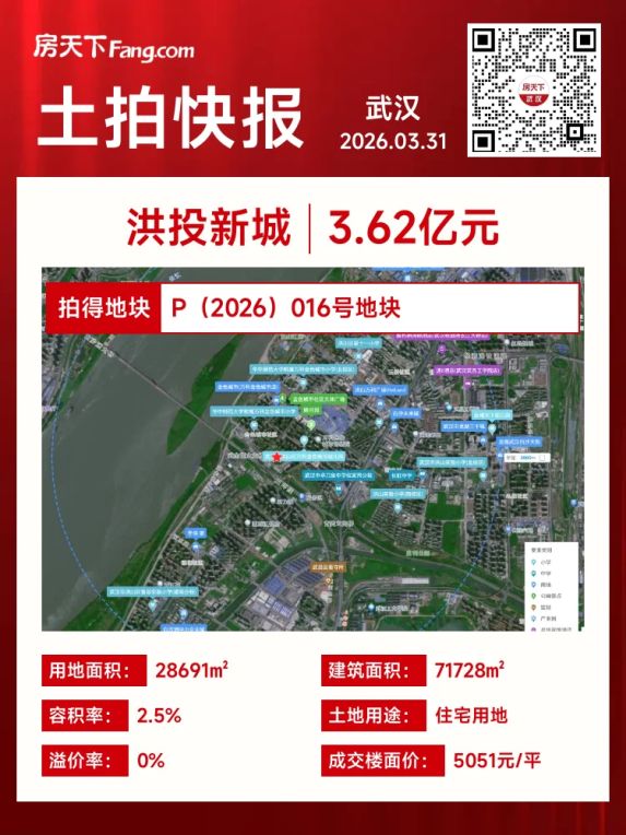 📅 3月31日,武汉土地市场成交一宗住宅用地,P(2026)016号地块。