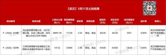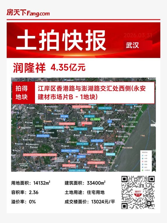 🏢【土拍快讯】3月31日,武汉江岸区P(2026)020号住宅用地成功出让,由武汉润隆祥房地产开发有限公司以底价4.35亿元竞得,成交楼面价13024元/㎡。