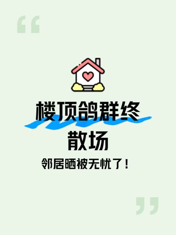 芜湖弋江嘉园小区最近发生件让居民们舒心的事儿——22栋楼顶几百只鸽子腾飞的情景彻底消失啦!事情还要从今年五月说起,住在该栋的陈女士向媒体反映,头顶的鸽群每天散养状态让她苦不堪言:满地的排泄物、扑棱的羽毛,晾晒衣物成了奢望。