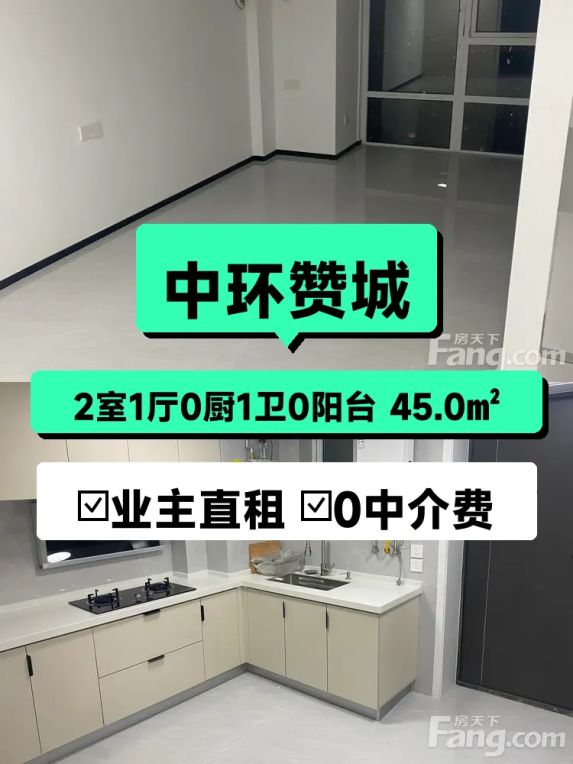自家南向两居室出租,中环赞城15层采光超棒!
